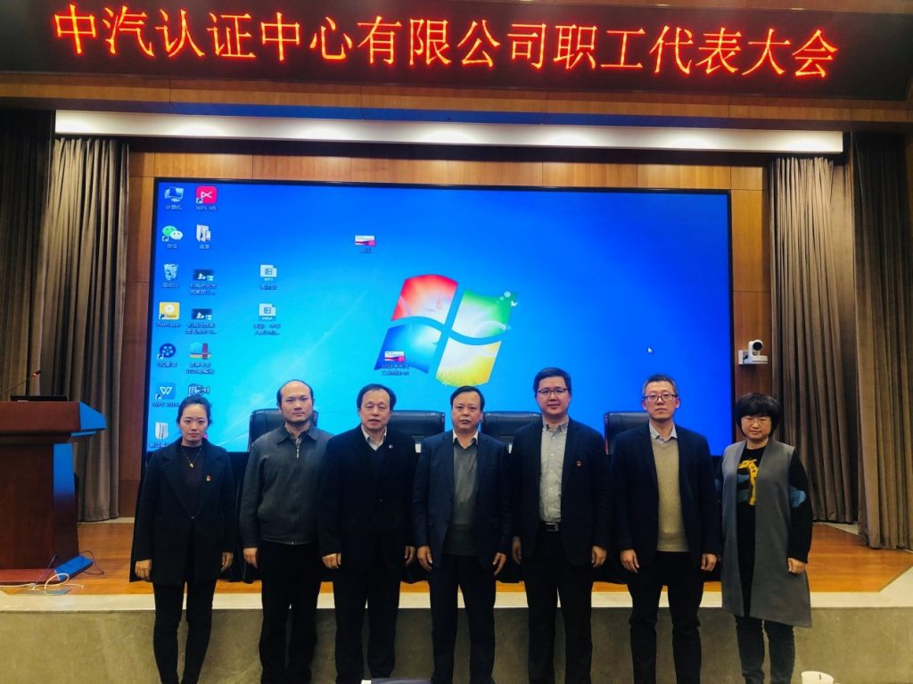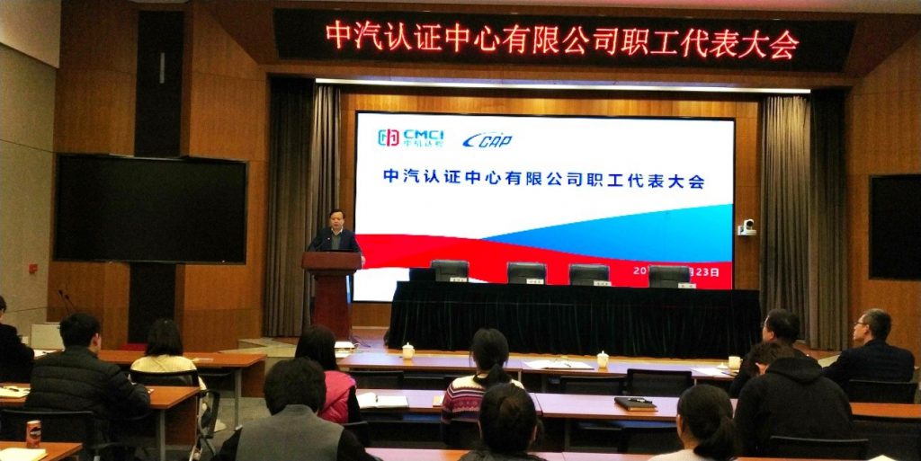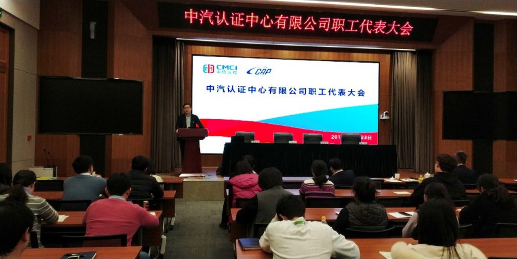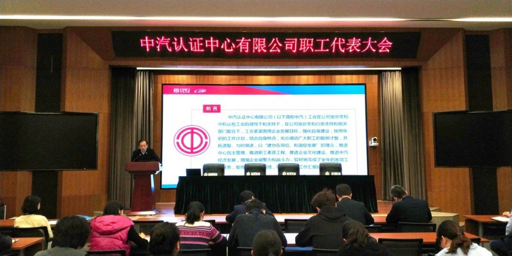 2019年12月24日,中汽认证第三届第一次职工代表大会暨中汽认证工会换届选举工作会议在机械总院集团五楼报告厅召开。中汽认证总经理何世虎、中汽认证党总支书记/副总经理陈晓东出席了会议,会议由第二届工会主席曹仲京主持,中汽认证全体在京职工代表参加了此次会议。