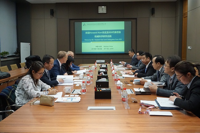 李建友副总经理对霍华德•科尔先生一行的到来表示热烈欢迎,并重点围绕集团在基础共性技术研究、标准化、检验检测、认证认可、行业服务等方面业务,以及在支撑中国装备制造业高质量发展中发挥的重要作用进行了系统介绍。霍华德•科尔对机械总院集团的热情接待表示感谢。他表示,自今年9月李建友副总经理率团访问BSI以来,机械总院集团与BSI的合作被提到新的高度,希望双方重点围绕设施管理、增材制造等方面形成全方位的务实合作,实现在标准、检测、认证等方面的共赢发展。双方还就2020年共同举办中英标准化高峰论坛等事宜进行了深入探讨。