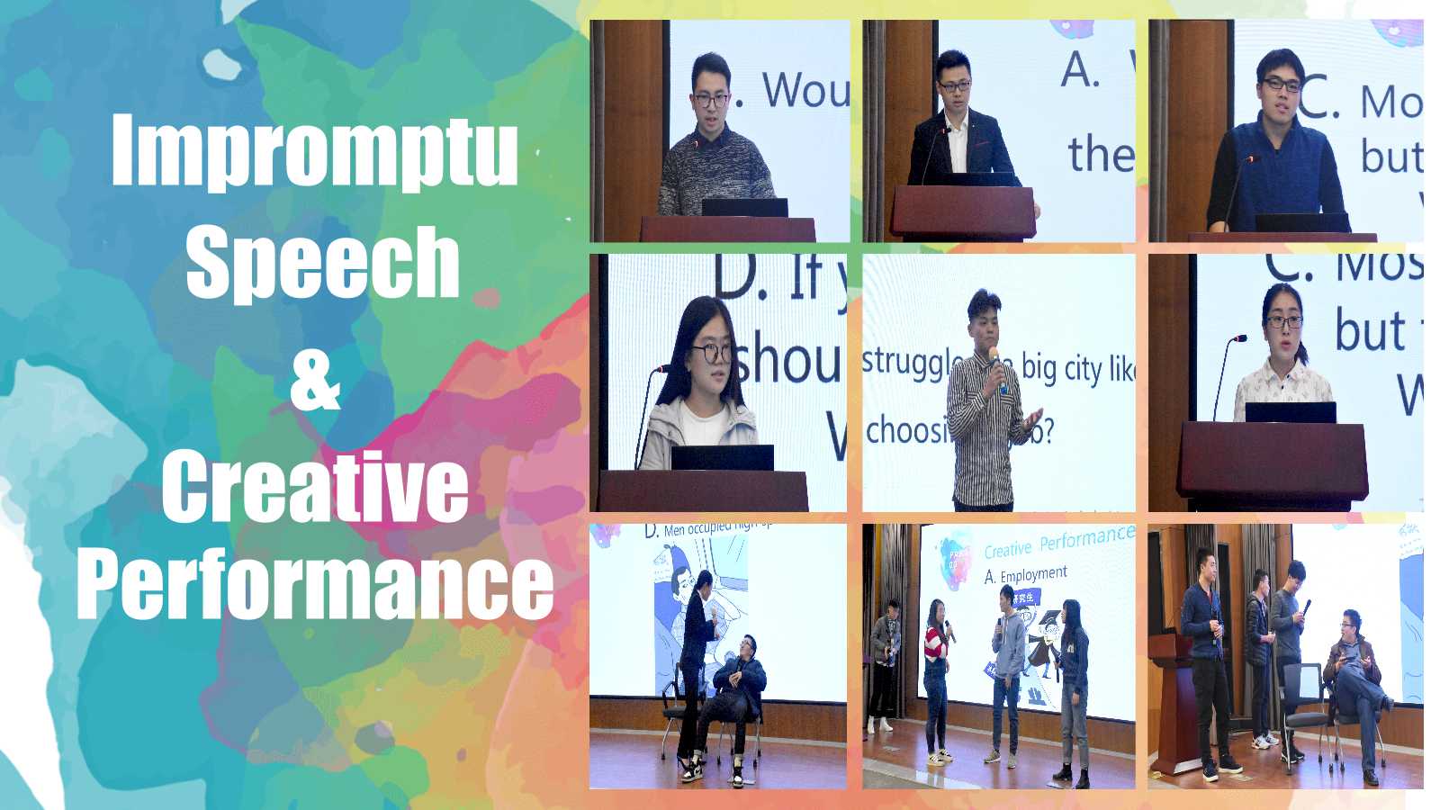本次比赛共设“自命题演讲”、“即兴演讲”和“创意表演”三个环节,“自命题演讲”的主题为“改革开放40周年”。根据比赛环节的设置,每位参赛选手不仅需要熟记文稿,还需要在现场灵活发挥。大家在舞台上充分展现了自己的英语风采,给评委和观众留下了深刻的印象。
