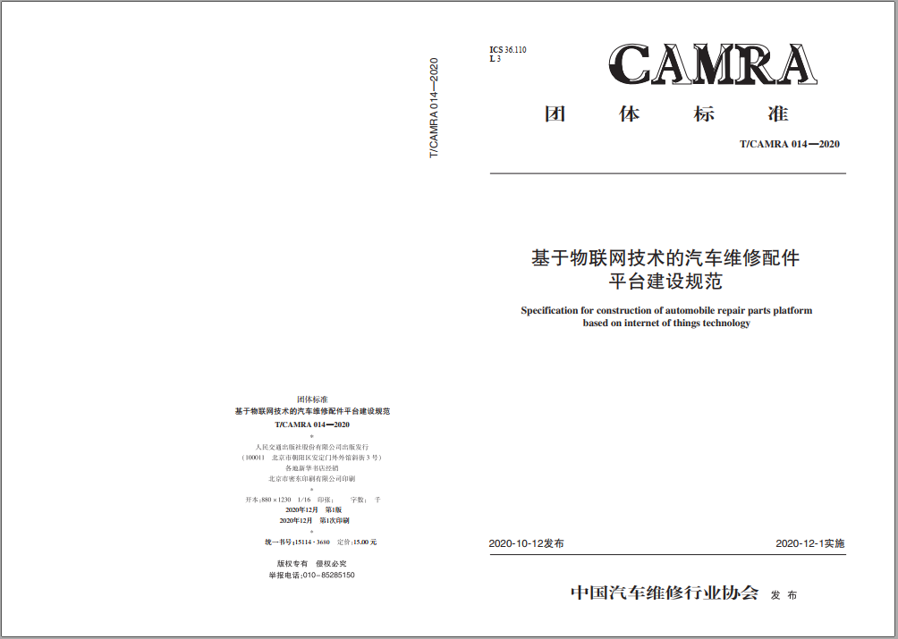 国内首个汽车维修配件平台建设团体标准——《基于物联网技术的汽车维修配件平台建设规范》日前已经中国汽车维修行业协会批准发布,并由人民交通出版社正式出版发行。该标准由中国汽车维修行业协会技术和标准化委员会提出并归口,中汽认证作为中国汽车维修行业协会技术与标准化委员会支撑单位,协同中机认检全程参与了该标准的起草制定工作。
