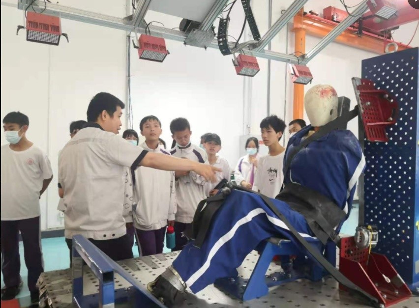 体验活动共分为五站,期间,由资深检验员薛铭、霍查、孔德嘉、姜涛、张存、向明全程讲解教学。第一站、汽车照明装置探险之旅,为师生展示科普汽车各类照明装置。第二站、探索神秘存在“汽车内饰件”。第三站、汽车安全带使用和机械装置观察。第四站、探索汽车座椅相关样品及台车、假人等试验装置。第五站、实车实景学习正确使用安全带及交通安全教育科普。知识点贯穿机械科学、人机工程学、材料工程学等,让同学们细细品味汽车当中看不见的大学问。