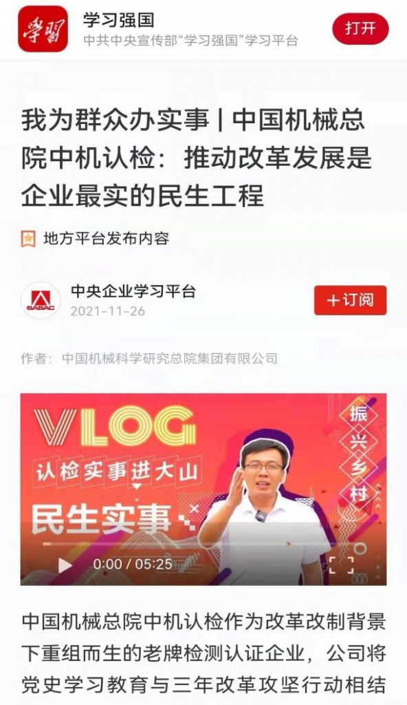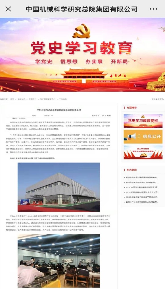 2021年11月26日,《中国机械总院中机认检:推动改革发展是企业最实的民生工程》一文刊登学习强国中央企业学习平台、中国机械总院官方网站。