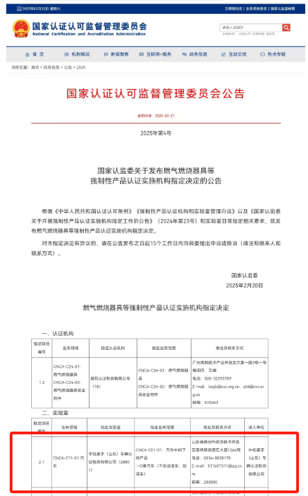 2月21日,国家认证认可监督管理委员会发布了强制性产品认证实施机构2024年度新增指定决定结果的公告(2025年第4号公告),根据《中华人民共和国认证认可条例》《强制性产品认证机构和实验室管理办法》以及《国家认监委关于开展强制性产品认证实施机构指定工作的公告》(2024年第23号)和实验室日常指定相关要求,中机车辆获批CCC指定实验室资质,实验室编号28801,授权检测能力覆盖CNCA-C01-01:汽车(O类汽车,不含运油车、加油车)。