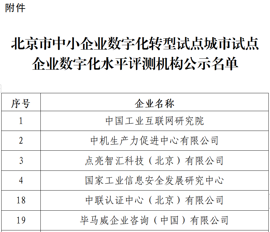 近日,北京市经济和信息化局正式公布了“北京市中小企业数字化转型试点城市试点企业数字化水平评测机构”名单,中联认证成功入选该名单。这一荣誉标志着公司在推动中小企业数字化发展方面的专业背景和技术能力得到了政府和社会的高度认可。