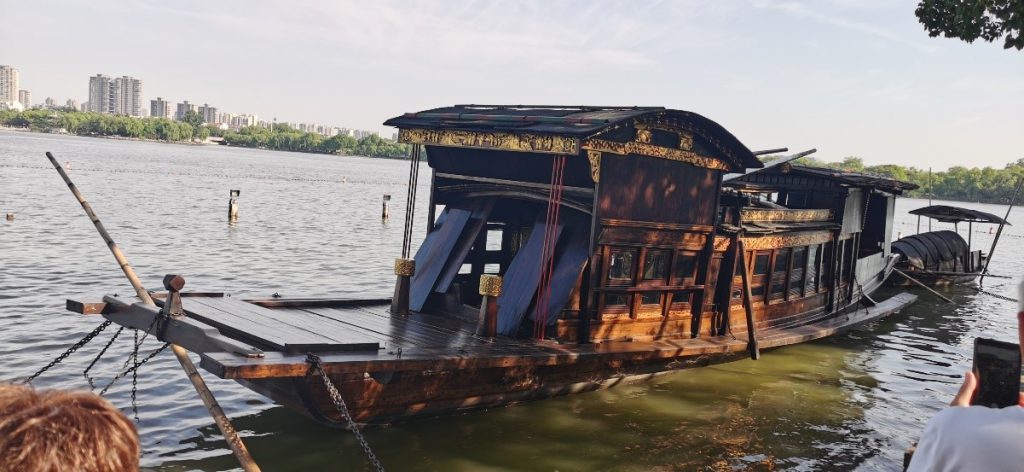 党员们乘船前往一大会址,在画舫上聆听讲师讲述“一个大党和一条小船的故事“,重温革命先辈开天辟地,前仆后继,百年奋斗,百年辉煌的历史。