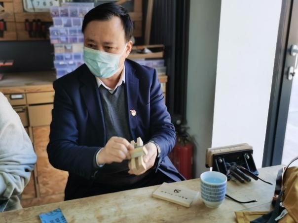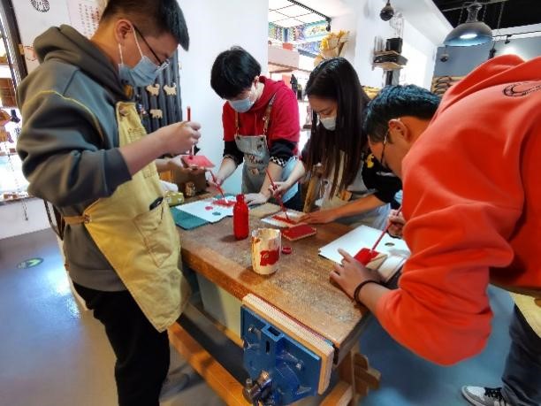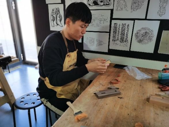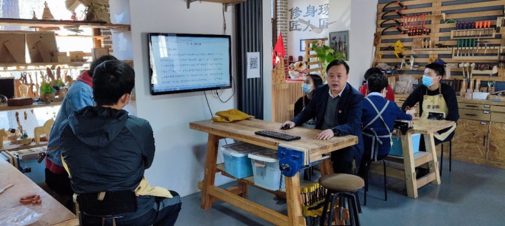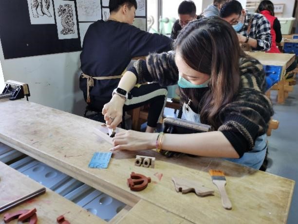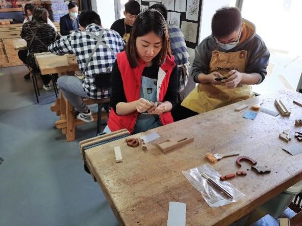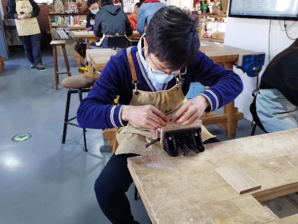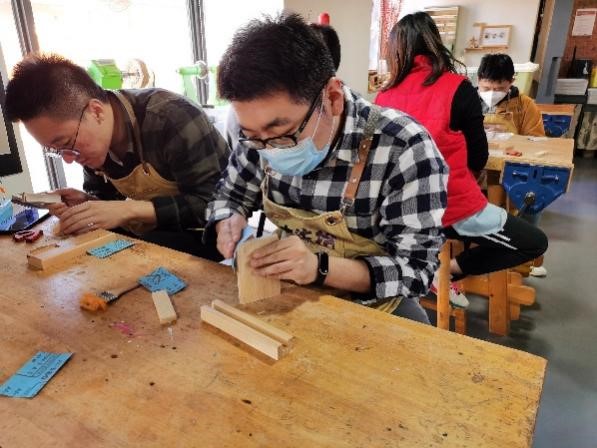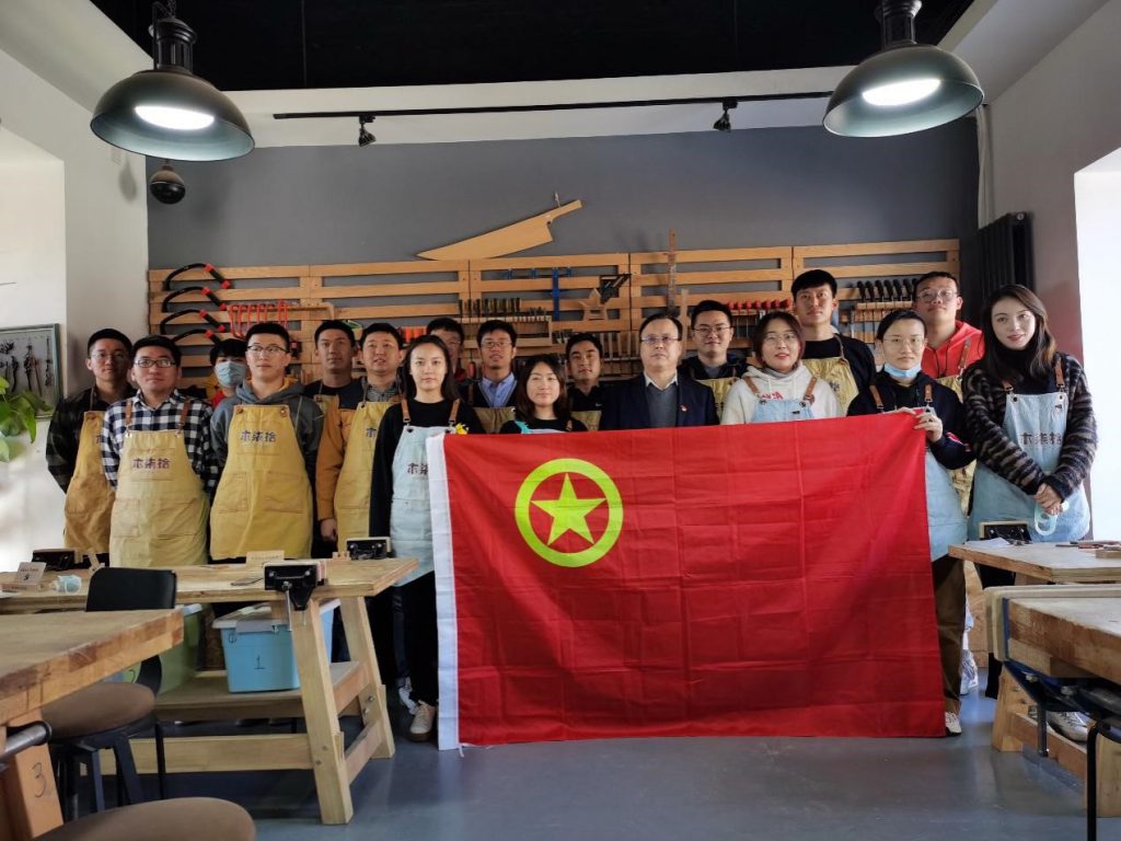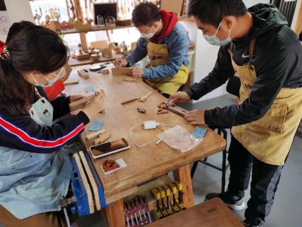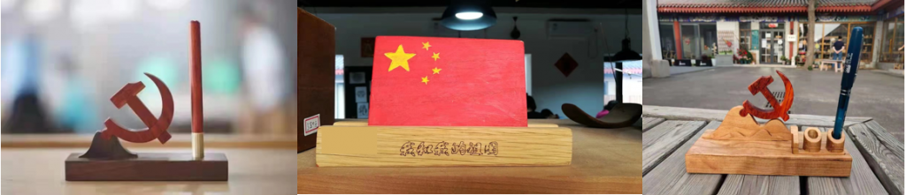 随后,各位团员在老师的讲解指导下,有序开展了木雕创作活动,通过“打磨-装配-上色-粘接-涂油”等环节,成功完成了爱国、爱党主题木雕作品的制作。这一过程充分展示了团员青年们的动手能力和创新能力,培养了大家的工匠精神和团队精神,表达了对党和国家发展的美好祝愿。
