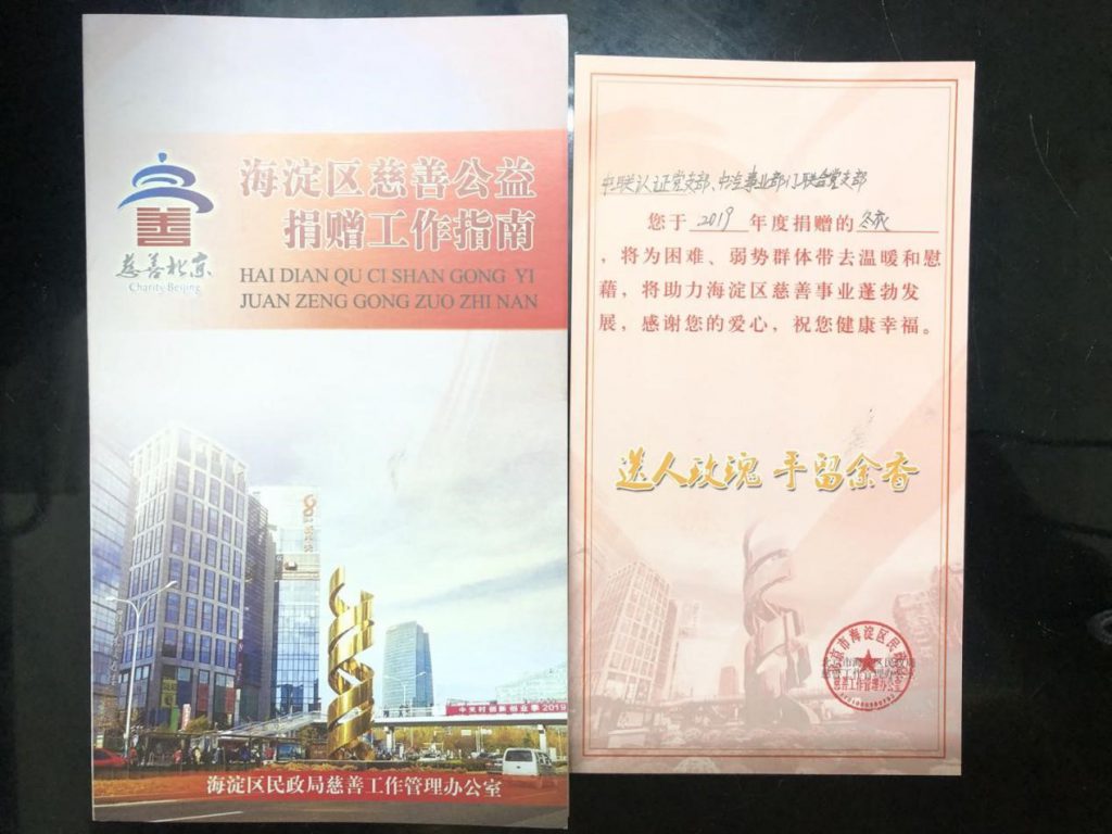 2019年11月26-27日,中联认证党支部与中汽事业部门联合党支部共同开展“不忘初心、牢记使命”主题党日——“衣旧情深,温暖冬衣”爱心捐赠活动,为最需要的人送去一份寒冬里的温暖,让爱传递。