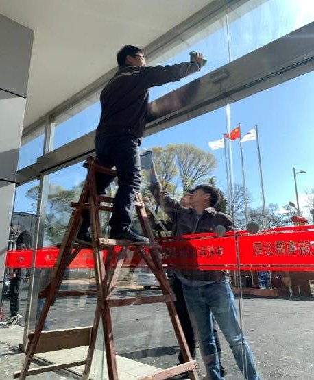 楼会议室桌椅进行摆放。现场大家用刮玻璃器、抹布、拖布等劳动工具,在各区域认真检查、仔细清理,擦拭门厅玻璃,摆放桌椅等,望着一块块挂满灰尘和污渍的玻璃,同志们鼓足干劲,忙的热火朝天,干的一丝不苟,擦掉每一丝灰尘,无私地贡献自己的力量。