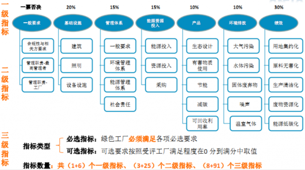 基础设施、管理体系、能源资源投入、产品、环境排放和绩效6大类,共细分为28项二级指标,二级指标分为必选要求和可选要求,总分共100分。申请流程见绿色工厂申请流程,评价模式:自评价报告+第三方评价报告。