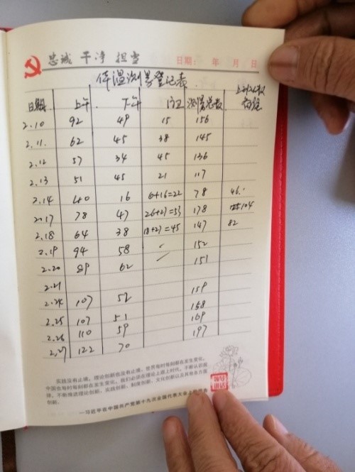 2月10日公司正式复工后,柴大夫主动放弃了个人休息时间,因公司防疫人员均来自党、团支部抽调的党员、团员,个人防护经验不足,仪器设备操作不熟练,柴大夫针对这些问题言传身教一一为他们做技术指导,每天坚守在防疫的最前线,这一干,就是52天,共计104个班次。每天值班结束后,她都会随笔记录一天的值班情况,以便更好地完善之后的工作。原本,她计划春节期间从老家接来父母,多陪陪他们,然而,突如其来的疫情打乱了计划。为把疫情防控工作做好,她毅然坚守疫情防控前沿阵地,中午回家匆匆吃口饭又早早赶到单位值班,舍小家顾大家,认真严谨、踏实工作的作风得到同事们的一致好评。疫情防控工作责任重大,体温检测把关必须严格,不管是熟络的员工还是上级领导,只要体温超标,一律不得进入公司。对于测温工作她一视同仁,“我不怕得罪人,我要对全体员工,对整个公司负责”。