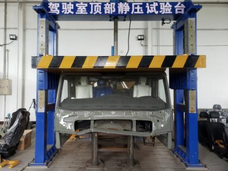 根据GB26512-2011和JT/T1178.1-2018要求。将驾驶室固定,实验装置是利用一块刚性壁障(尺寸不小于整个驾驶室后围面积,在驾驶室后端向前施压。