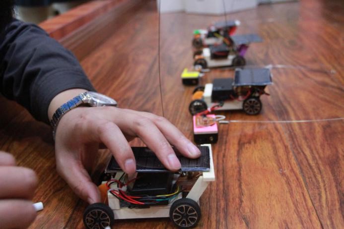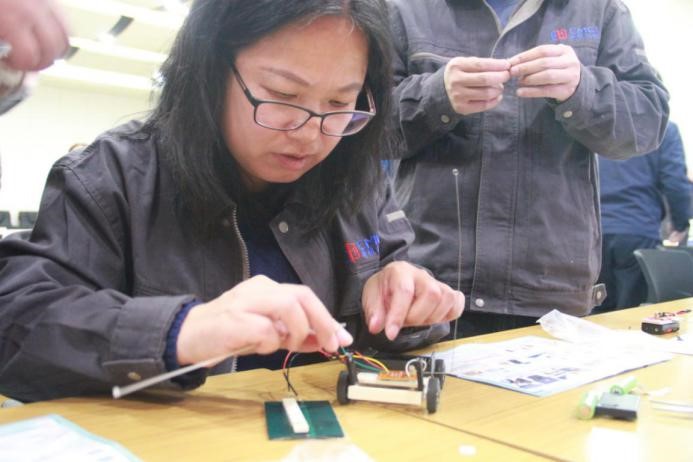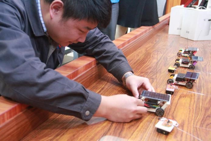 第三关——绿色节能创新实践,该项比赛对各小组的团结协作能力进行了考验,考察了各组人员的创新实践能力,活动要求本着绿色环保、创新发明、团结协作的原则,由主办方提前收集到实验室及周边的废料素材进行二次利用。10:40分在主持人令下比赛开始,各小组领取素材发散思维精心设计制作小发明,材料不限、思路不限、通力合作,快速各类元件,黏贴木质板材,连接天线信号收发器,在焦灼的35分钟内,各组完成了自己的遥控车简易模型。最后,评审组四名专家根据各组的作品,以机械结构、可靠性、美观性、动能运用等方面进行综合评定,并最终核算分数。