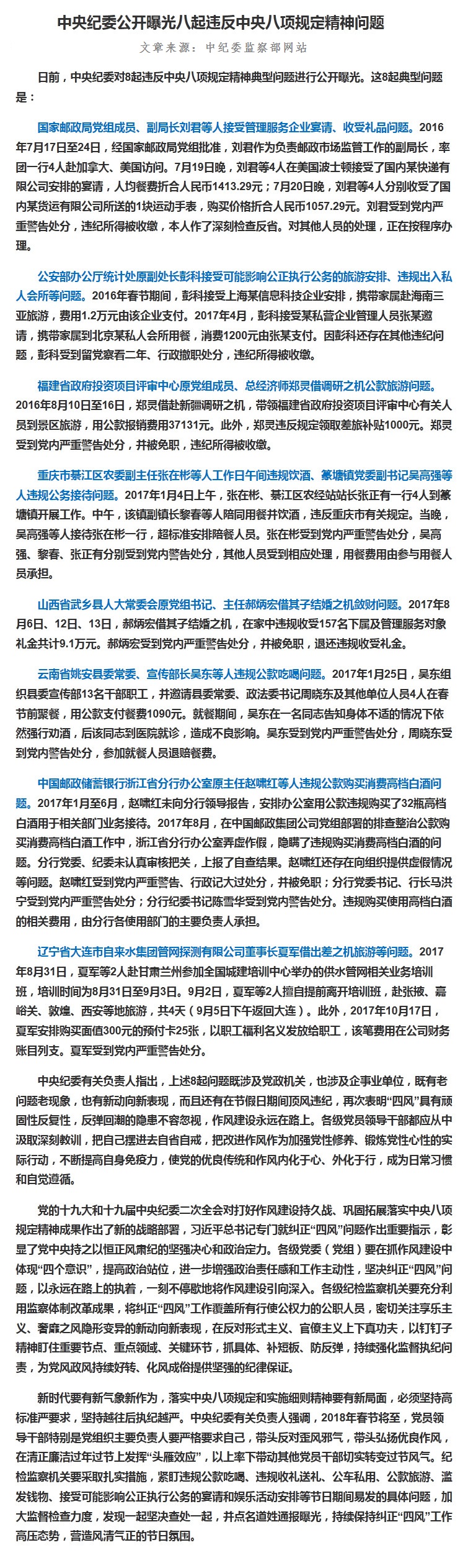 2月8日中央纪委公开曝光八起违反中央八项规定精神问题